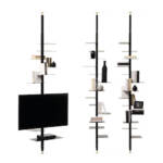 Adelaide wordt geleverd met 13 planken, voorbereid voor bevestiging aan het plafond (plafondhoogte van 236 cm tot 302 cm) of door een muurbeugel in mat goud metaal. Het Adelaide TV televisiemeubel wordt geleverd met 10 planken en een vesa televisiebeugel