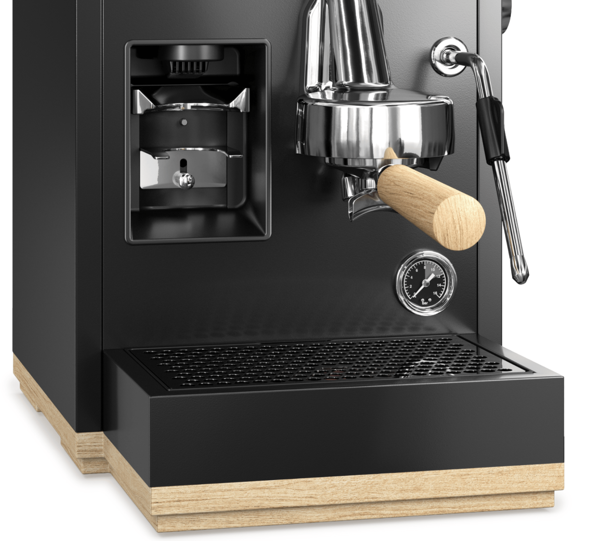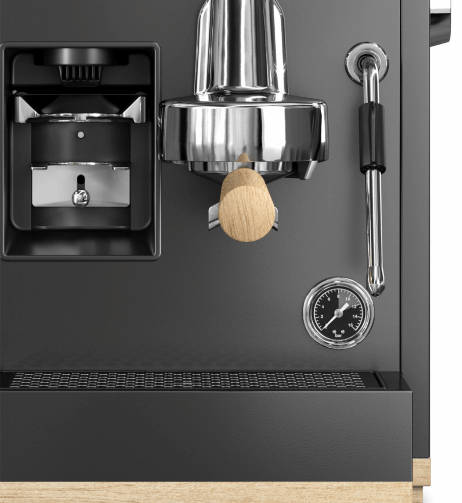 Gemaakt van hoogwaardig mat staal in basaltgrijs, met geïntegreerde versiering van echt hout van pure rode eik. Een uitgebreide set elegante en praktische accessoires rondt het ontwerp van de espressomachine af Zeefdragers, melkkannetje, tamper, tampermat, borstel en reinigingsdoek zijn perfect afgestemd op het ontwerp van de espressomachine. Een uitneembaar waterreservoir van 2,5 liter met waterfilter en de uittrekbare lekbak zorgen voor een eenvoudige bediening.